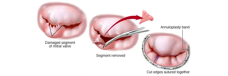 - Annuloplasty: A ring is placed around the base (annulus) of the mitral valve to tighten or reinforce it and restore its shape.